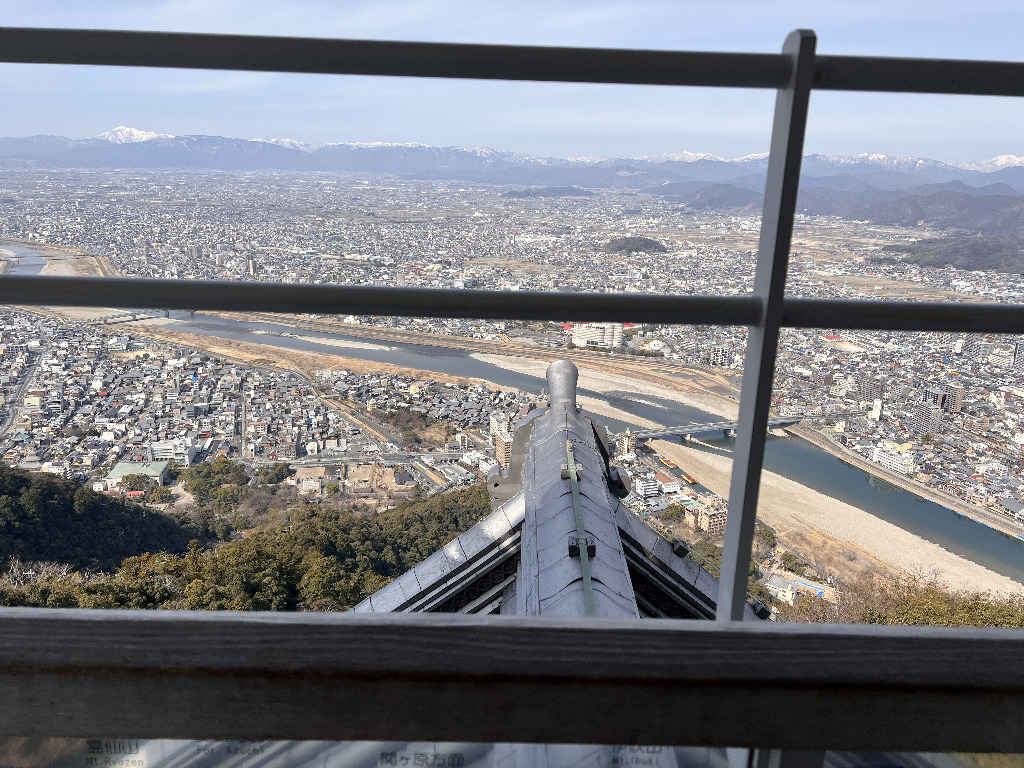 天守からの絶景 — 山頂の天守(復興天守)からは、長良川や濃尾平野を一望できます。信長がこの景色を眺めながら天下を構想したと思うと、感慨もひとしおです。晴れた日には遠くに雪をかぶった山々まで見渡せることも。